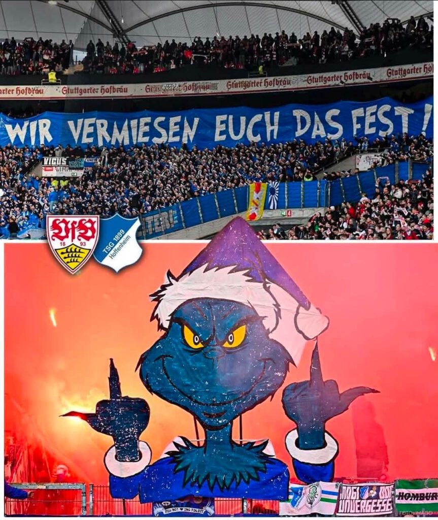 Mit diesem an sich lustigen Versprechen an die Hausherren – inklusive einem blauen Grinch mit Mittelfinger begann das Spiel. Allerdings vermieste man uns erst einmal die Stimmung, denn das Riesenbanner ward direkt vor uns platziert, so dass die ersten 90 Sekunden des Spiels für uns nichts weiter war als ein Blick ins Blaue. Wir sahen rein gar nichts, dennoch wurde dahinter gesungen und gehüpft. Das Positive daran war, dass wir dadurch auch nichts von den Rauchschwaden im Heim der Schwaben abbekamen.